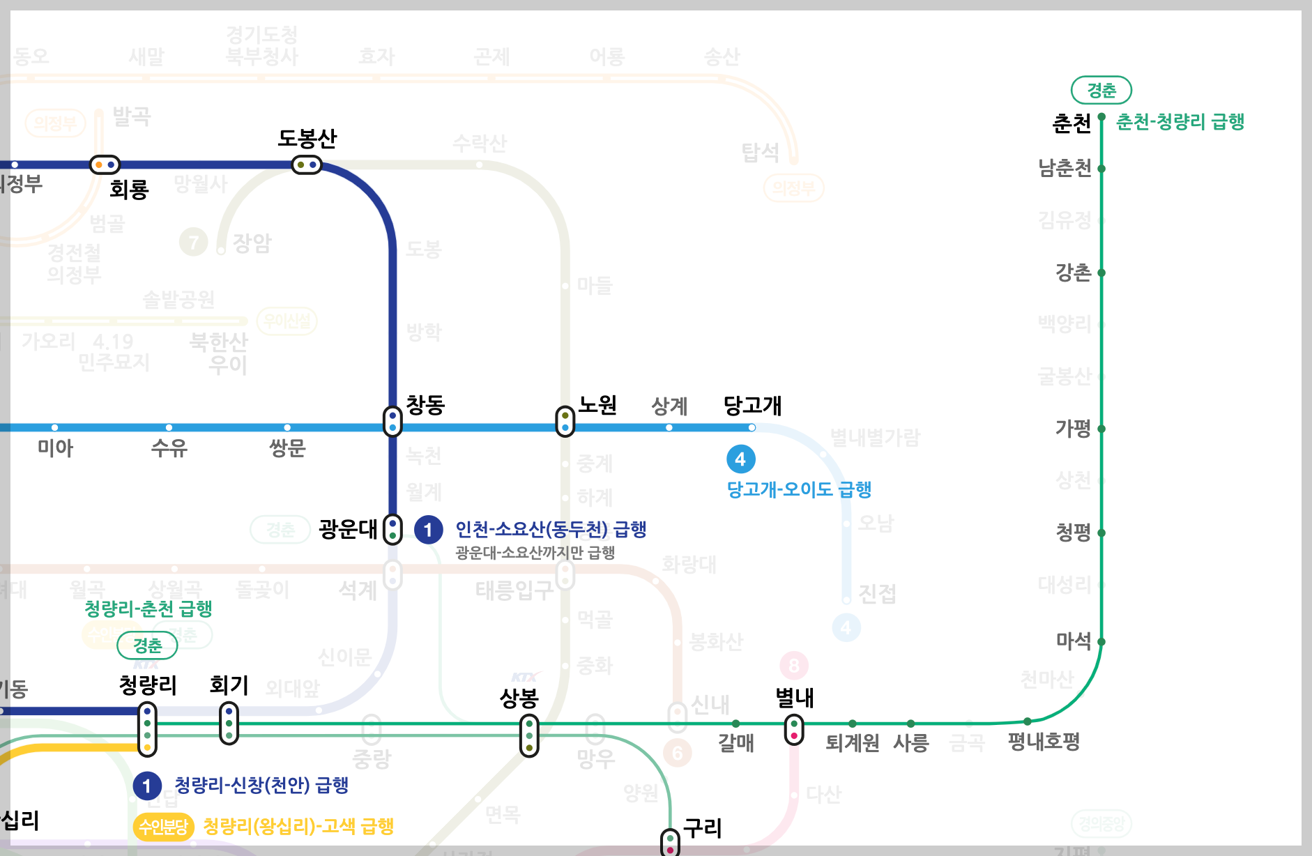 경춘선 급행 노선은 청량리역-회기역-상봉역-갈매역-별내역-퇴계원역-사릉역-평내호평역-마석역-청평역-가평역-강촌역-남춘천역-춘천역에 정차합니다.