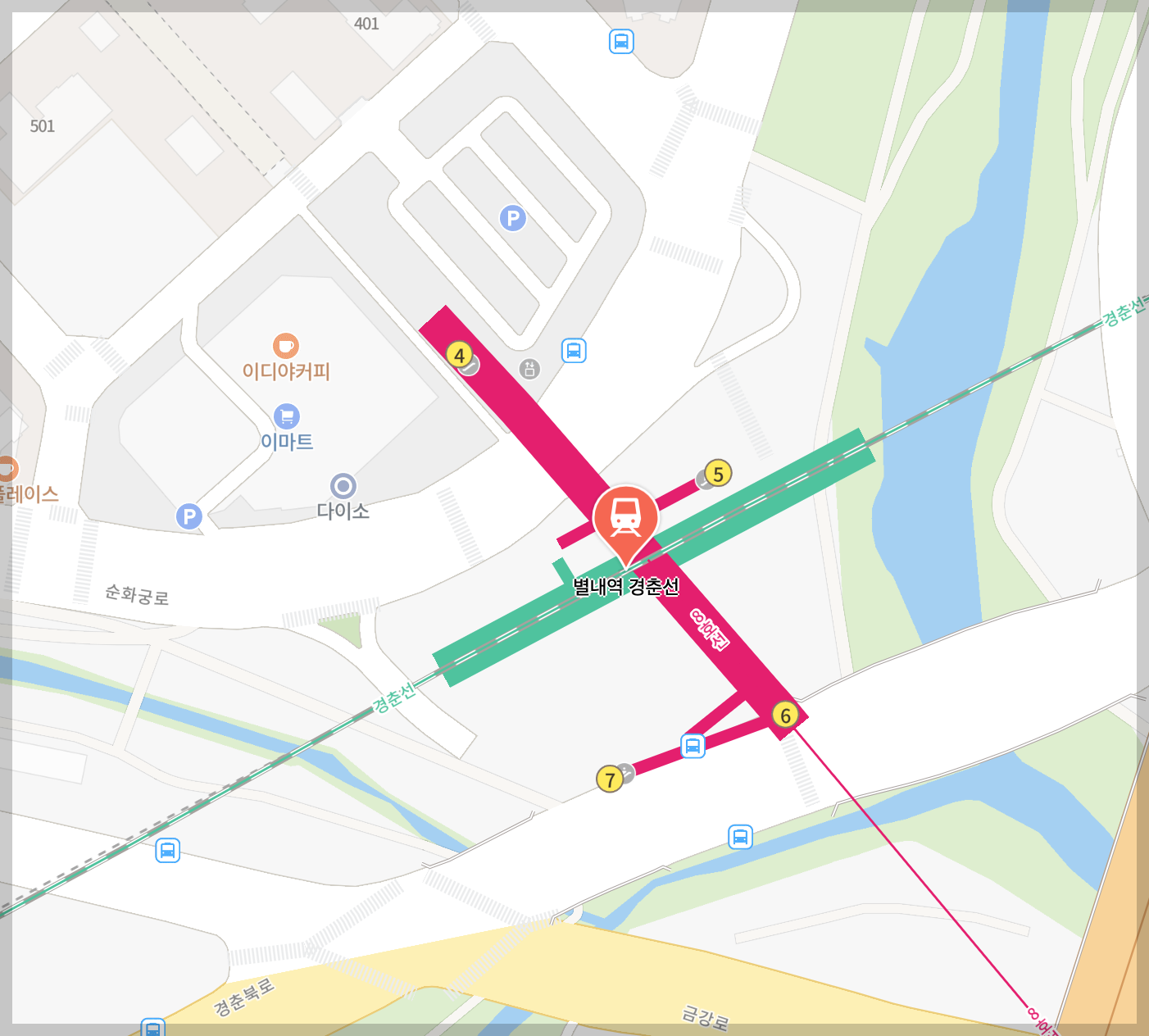 별내행정복지센터, 별내동 우체국, 별빛마을 방면, 은하수물길공원, 별내중앙공원, 한별중학교, 별빛도서관