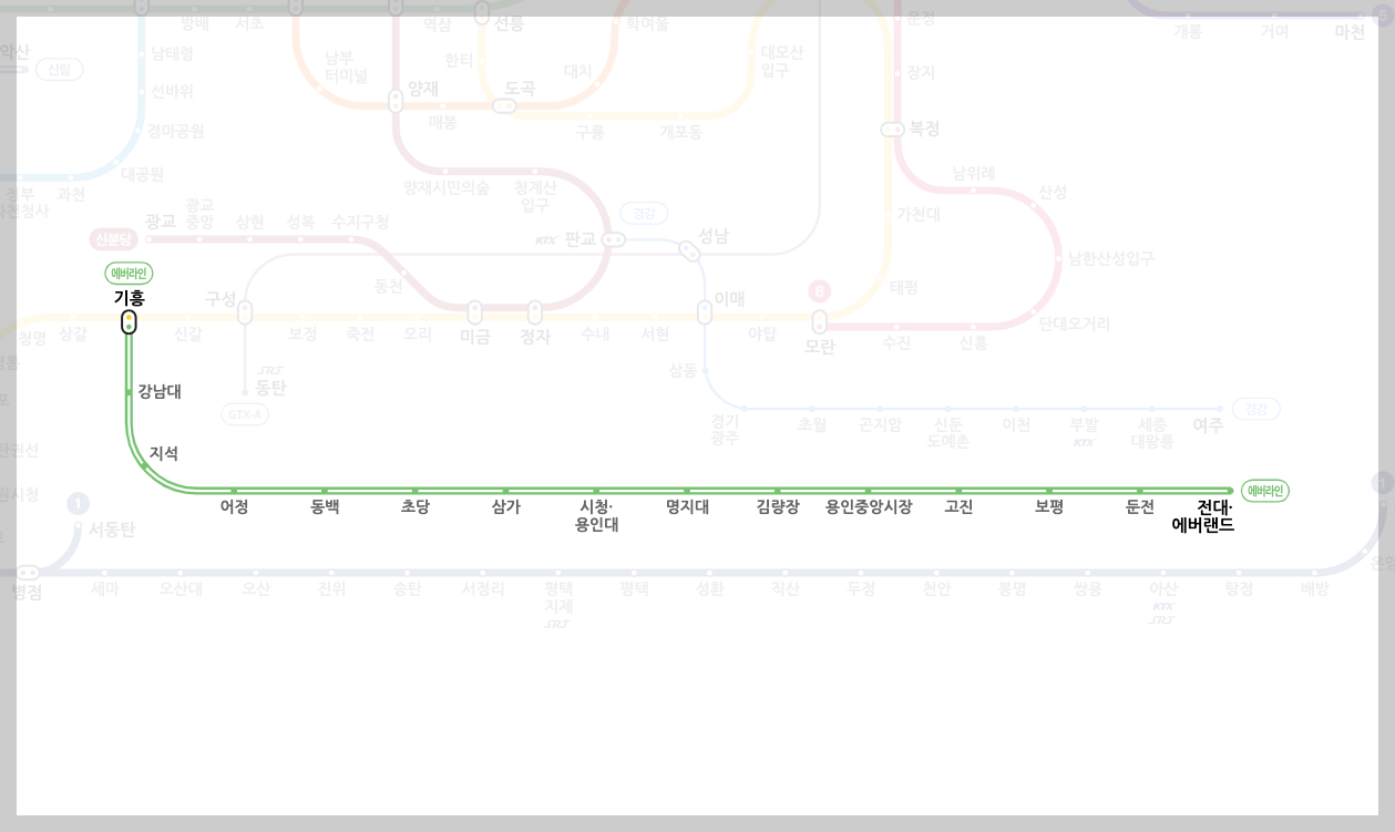 에버라인의 시작점은 기흥역입니다. 기흥역에서는 수인분당선과 환승이 가능해 다른 지역으로의 연계가 용이하며, AK& 쇼핑몰과 백남준아트센터 같은 주변 시설도 있어 생활과 문화가 잘 어우러진 역이죠. 기흥역 이후에는 강남대역, 지석역, 어정역, 동백역, 초당역 등 용인의 주요 거점을 지나는 역들이 차례로 이어집니다. 특히 동백역과 시청·용인대역은 주변에 교육과 행정 기관이 있어 지역 주민들에게 필수적인 기능을 하는 역이기도 합니다.