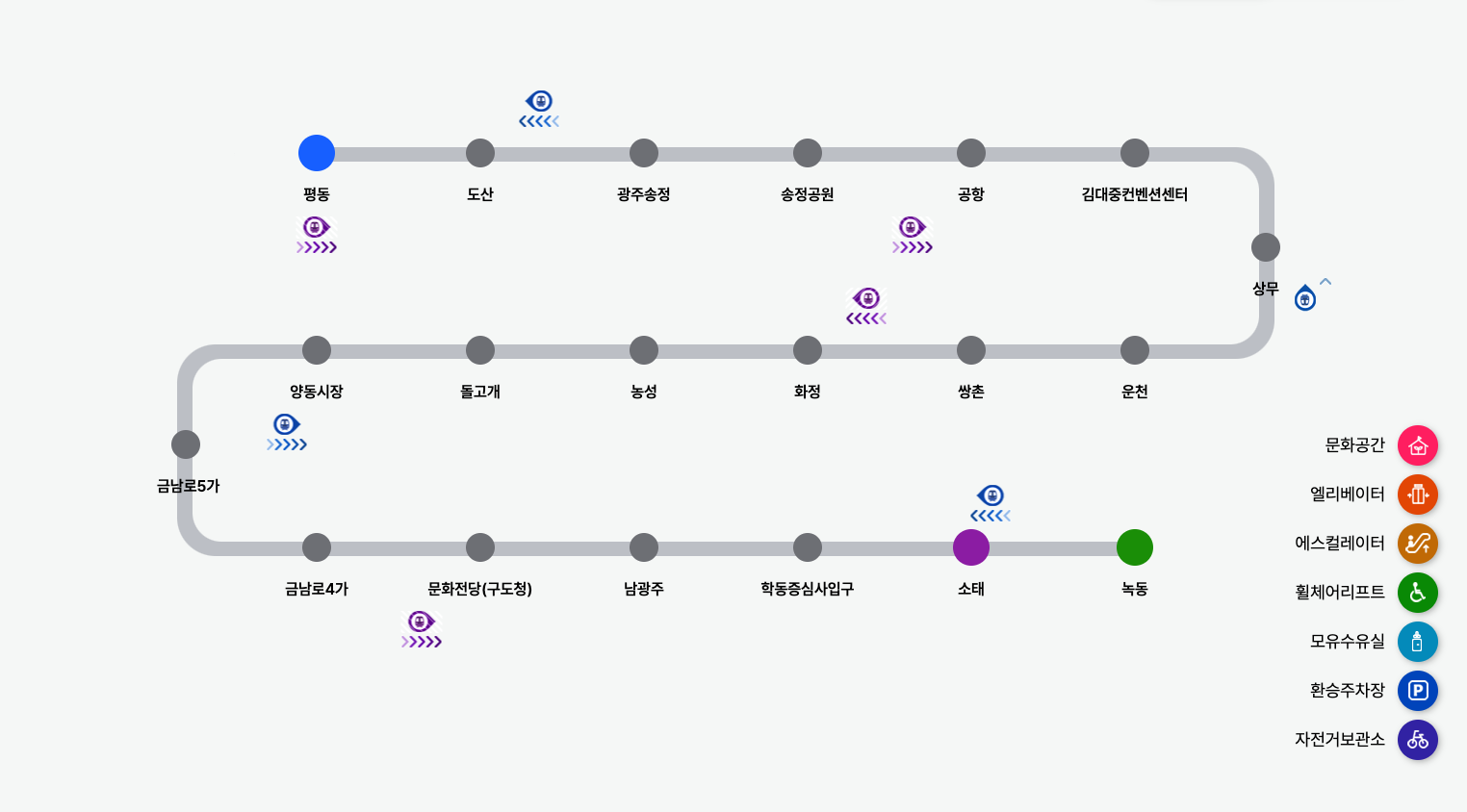광주 지하철 1호선은 도시 내 주요 지역을 연결하여 광주의 핵심 교통망을 구성하고 있습니다. 상무지구와 같은 신도심 지역을 비롯해 광주공항을 지나며 공항철도의 역할도 수행하고 있죠. 이러한 경유지 덕분에 출퇴근, 출장, 여행 등 다양한 목적을 가진 승객들이 편리하게 이동할 수 있습니다.