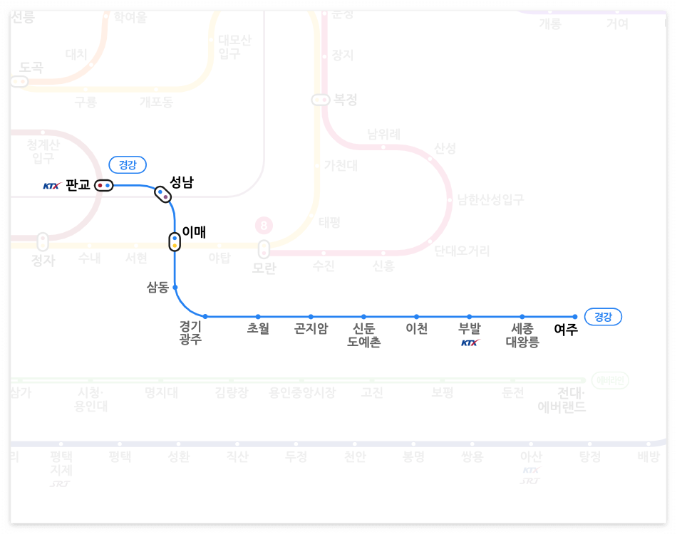 이매역은 2016년 9월 24일에 경강선 구간이 개통되며 대중교통 허브로서 중요한 역할을 맡게 되었습니다. 기존에 철도 교통에 있어서 소외된 지역이었던 경기도 광주와 여주, 이천이 경강선을 통해 다른 수도권 지역과 철도로 연결된 것이죠.