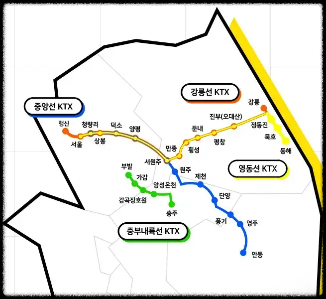 • 특이사항: 서울역부터 진부역까지는 강릉선과 동일하지만, 영동선은 진부역의 다음 정차역이 정동진역-묵호역-동해역입니다.
