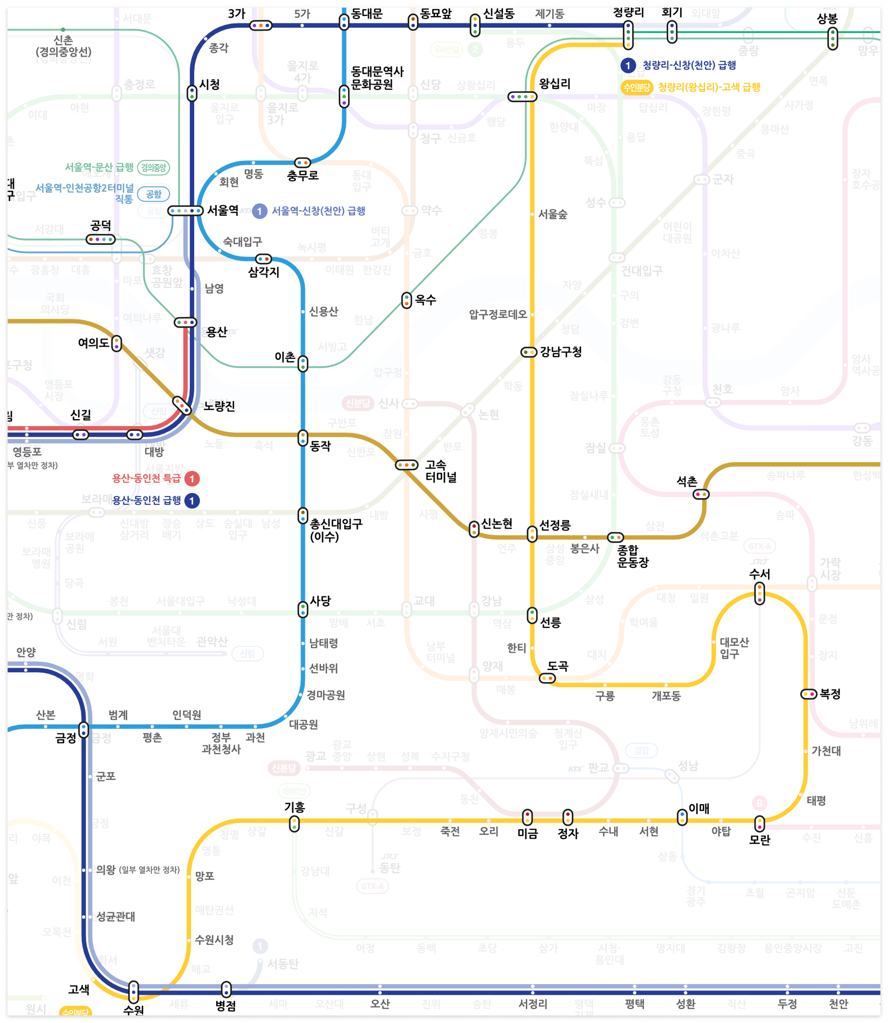 노선도를 보시면 아시겠지만, 수인분당선의 청량리역부터 오리역까지의 서울-분당 구간은 정차역이 완행열차와 똑같습니다. 급행노선이 실질적으로 운행되는 구간은 죽전역부터 고색역 사이의 용인-수원 구간이죠.