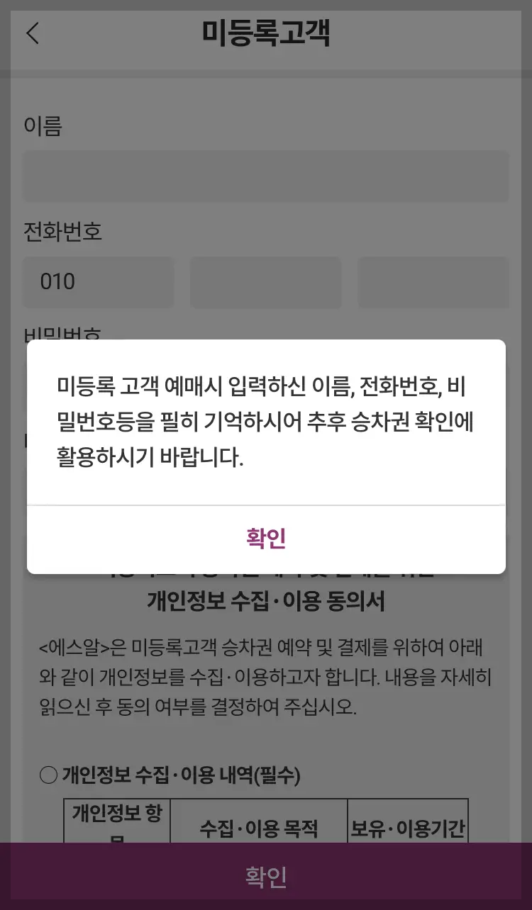 [미등록고객 예매] 또는 [미등록 고객] 버튼을 누르면 홈페이지와 모바일 앱 모두 팝업 메시지가 나타나는데요. 홈페이지에서는 홈티켓으로 바로 발권받아야 한다는 내용의 안내 메시지가 나오고, 모바일 앱에서는 예매시 입력한 고객정보를 반드시 기억해야 한다는 내용의 안내 메시지가 나옵니다.