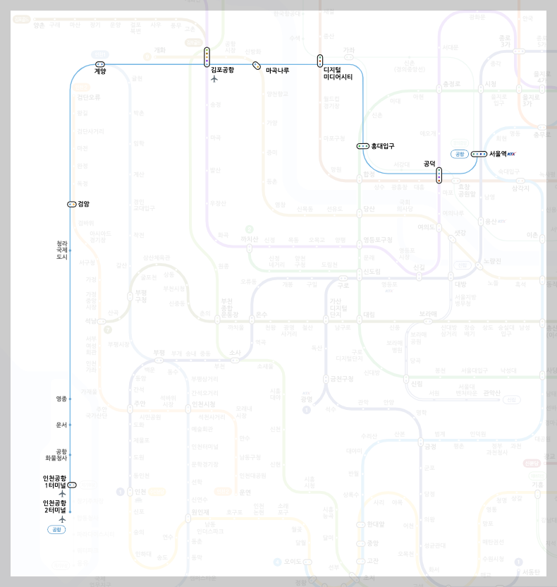 서울역에서 출발하는 공항철도는 일반열차와 직통열차 두 가지 노선이 있는데요. 일반열차는 서울역부터 인천공항2터미널역까지 모든 역에 정차하는 반면, 직통열차는 중간에 있는 역을 모두 통과하여 서울역-인천공항1터미널역-인천공항2터미널역에만 정차합니다.